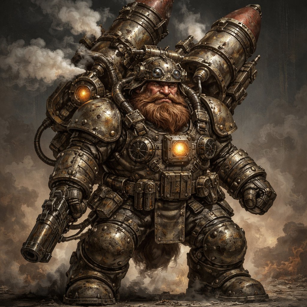 A dwarven warrior wearing an rpg backpack and holding grenades