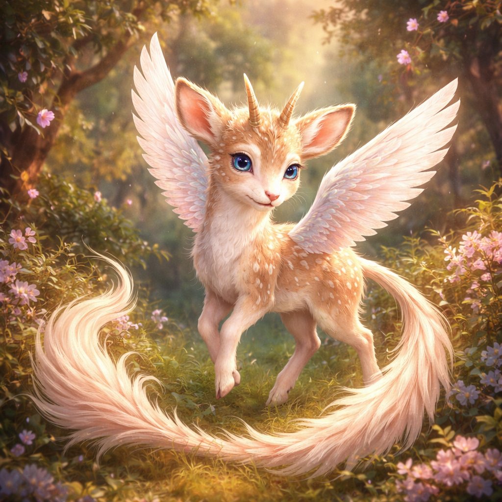 Small deer like creature with long tail tuft a small horn that starts where deer antlers are and it has big wings