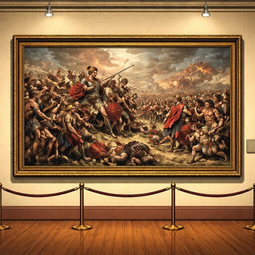 No caricature, no speech bubbles, realistic, a wall with a large painting of a classic Roman battle in the 19th c Englis...