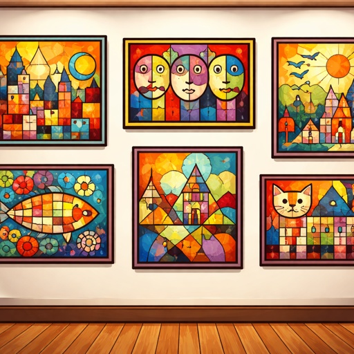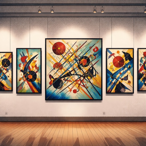 No caricature, no speech bubbles, realistic, a wall with several modern paintings in the style of vassily kandinsky in a...