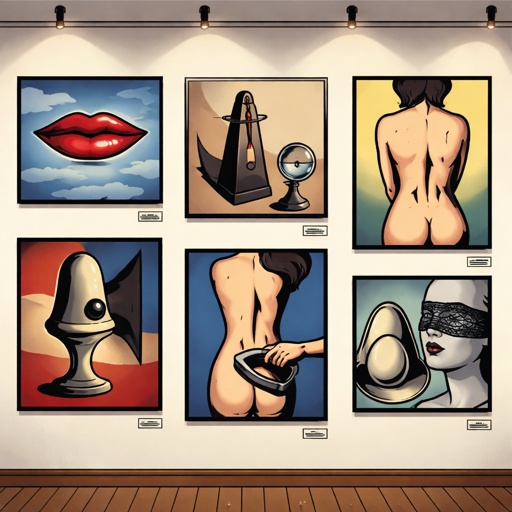 No caricature, no speech bubbles, realistic, a wall with several modern paintings in the style of man ray in an art gall...
