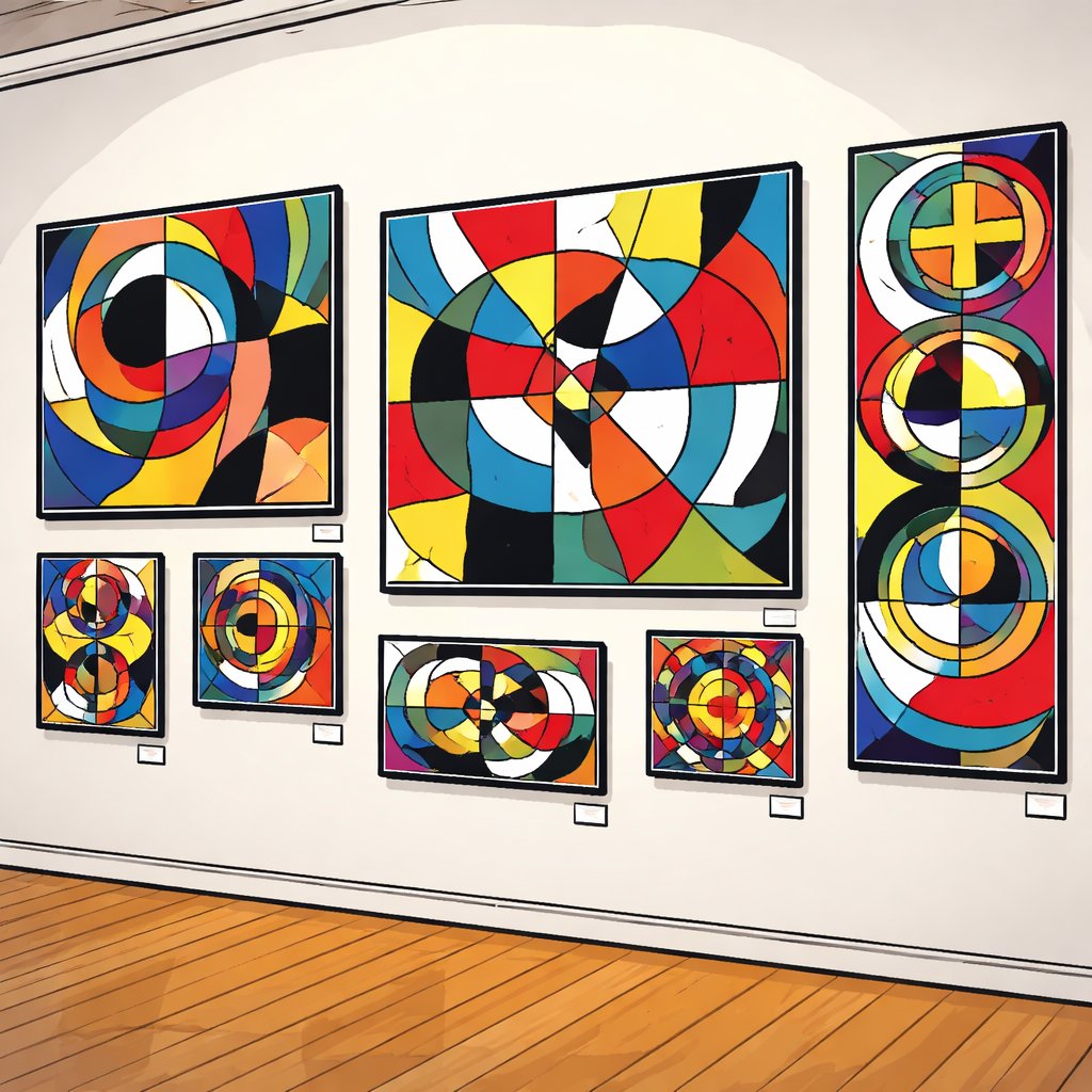 No caricature, no speech bubbles, realistic, a wall with several modern paintings in the style of sonia delaunay in an a...