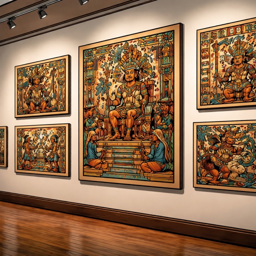 No caricature, no speech bubbles, realistic, a wall with several Mayan and in style paintings in an art gallery no peopl...