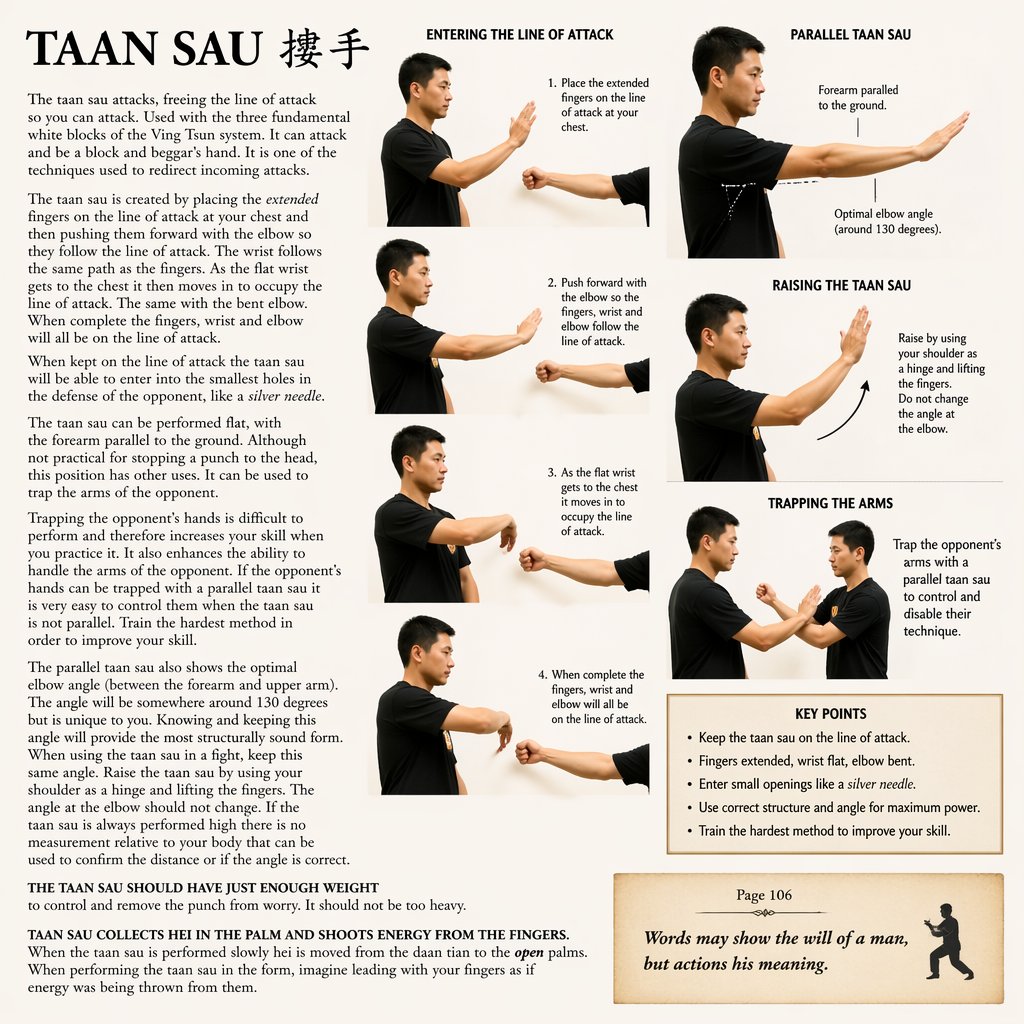attacks, freeing the line of attack so you can attack. Used with the three fundamental blocks of the ving tsun system. Than can a block and beggar's hand.Itis one of the The techniace 1s used to redi. arm parallel to the ground it can also be used to trap and control an incomin technique, disabling it from use. The ran sal is created by placing the fingers on the line of attack at your chest and then pushing them forward with the elbow so they follow the line of attack The wrist follows the same path as the fingers. As the wrist gets to the chest it then moves in to occupy the line of attack. The same with the elbow. then complete the fingers, wrist and elbow will all be on the line of attack. When kept on the line of attack the taan sau will be able to enter into the smallest holes in the defense of the opponent, like a needle. The taan sau can be performed flat, with the forearm parallel to the ground. Although not practical for stopping a punch to the head, this position has other It can be used to trap the arms of the opponent. Trapping the opponent's hands is difficult to perform and therefore increases your skill when you practice it. It also enhances the ability to handle the arms of the opponent. If the opponent's hands can be trapped with a parallel taan sau it is very easy to control them when the taan sau is not parallel. Train the hardest method in order to improve your skill. The parallel taan sau also shows the optimal elbow angle (between the forearm and upper arm). The angle will be somewhere around 130 degrees but is unique to Knowing and keeping this angle will provide the most structurally sound form. When using the taan sau in a fight, keep this same angle. Raise the taan sau by using your shoulder as a hinge and lifting the fingers. The angle at the elbow should not change. If the taan sau is always performed high there is no angle is correct. measurement relative to your body that can be used to confirm the distance or THE TAAN SAU SHOULD HAVE JUST ENOUGH WEIGHT to control and remove the punch from worry. It should not be too heavy. TAAN SAU COLLECTS HEI IN THE PALM AND SHOOTS ENERGY FROM THE FINGERS. When the taan sau is performed slowly hei is moved from the daan tian to the palms. When performing the taan sau in the form, imagine leading with your fingers as if energy was being thrown from them. Page 106 Words may show the will of a man, but actions his meaning.