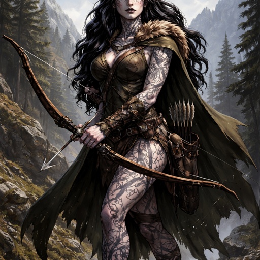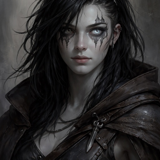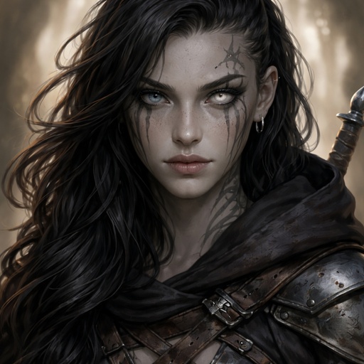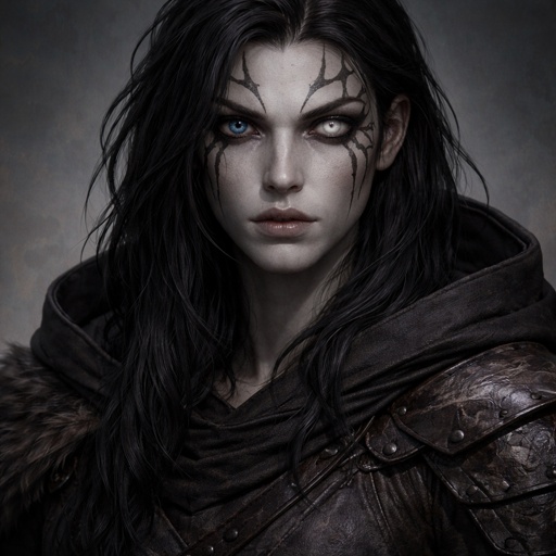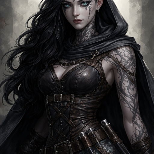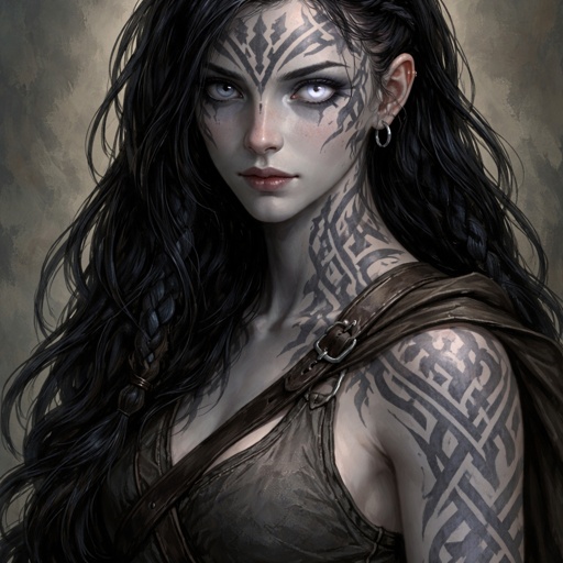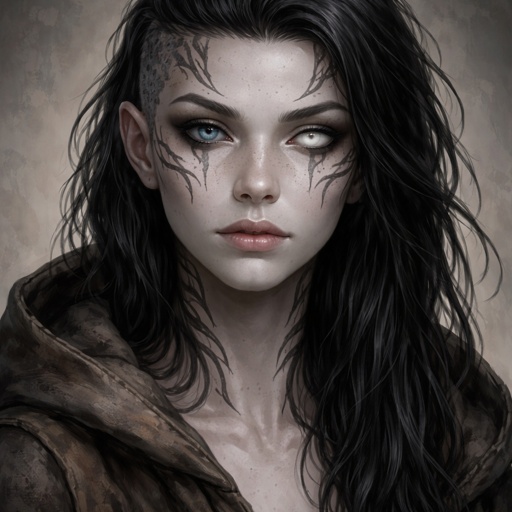 21 year old girl, half elf half Druid dark hair with black raven feathers throughout her hair sporadically but her hair ...