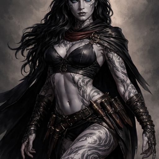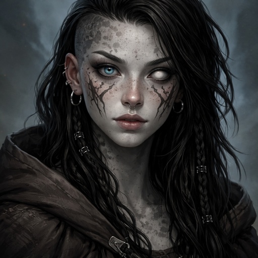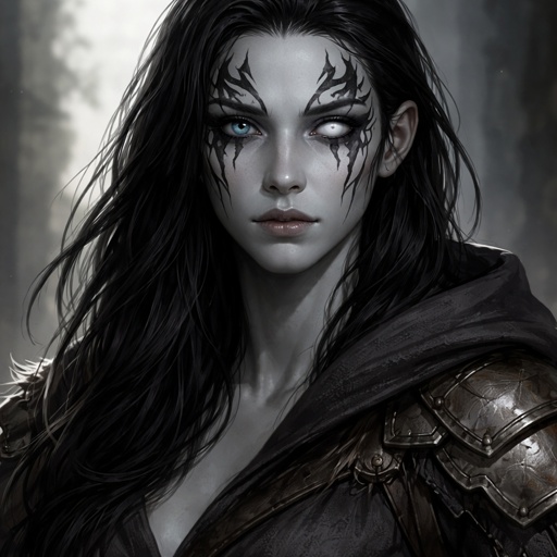 A female goliath from dnd with light grey skin, the right eye is dark blue and the left is almost fogged over (she is bl...