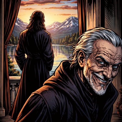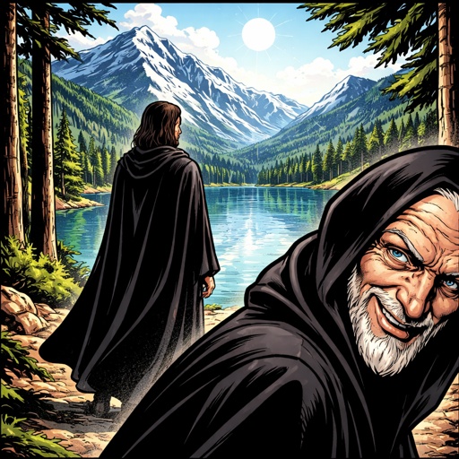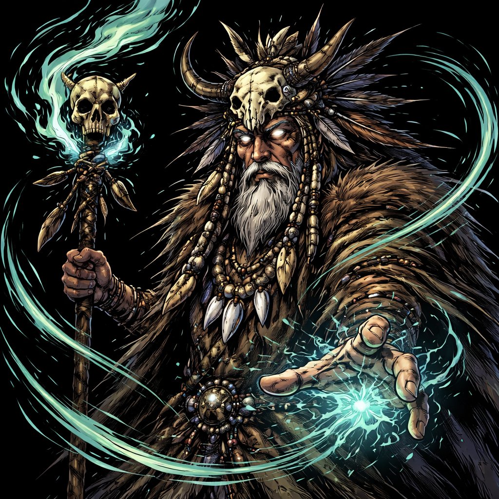 Realistic, refined . A mystic shaman see him in three-quarter view from the left. The background is black. There are no speech bubbles.