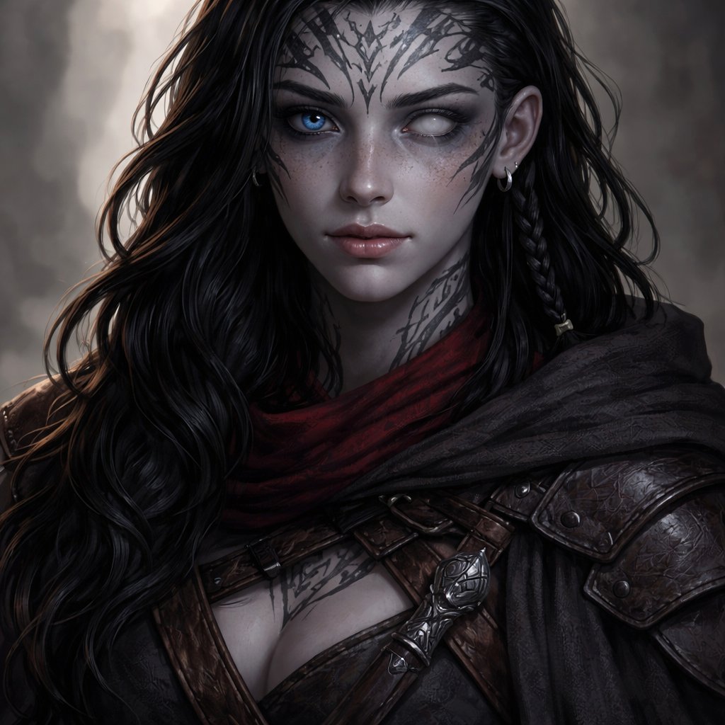 A female goliath from dnd with light grey skin, the right eye is dark blue and the left is almost fogged over (she is blind in the left eye). Her har is black and she is a rouge. She has two tattoos that start at a point under her eyes and goes up to her her and then twists down to her back around the legs to the toes but you only need to generate her portrait (as in mostly her face and a bit of her torso). She is 20 and wears a bit more clothes, she is probably wearing a cloak but the hood is not up and she looks a bit androgynous (I want her boobs to be covered)