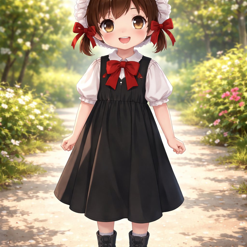 His name is Argentina he’s a little 5 year old he has a white bonnet it barely covers his hair and he has brown hair and he has a white shirt with puffy short sleeves and under it is a simple black long overall dress not Jean simple and he has gray socks and black boots and he is Japanese skin color and he has red ribbons on both sides of his head and he has a red ribbon on his chest