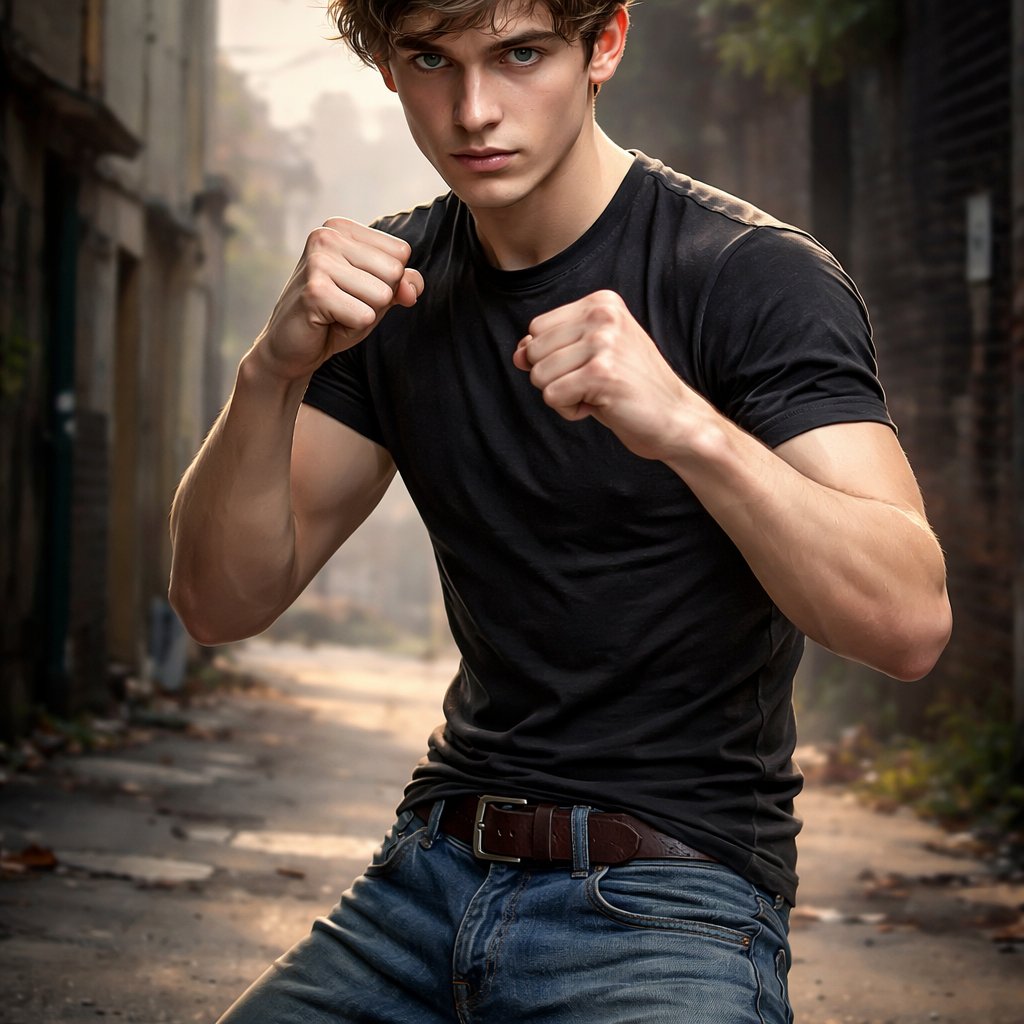 A 17 year old boy who has brown hair and blue eyes. He is wearing a black shirt and jeans. He looks strong. Full body and face appearance can be seen. He looks ready to fight.