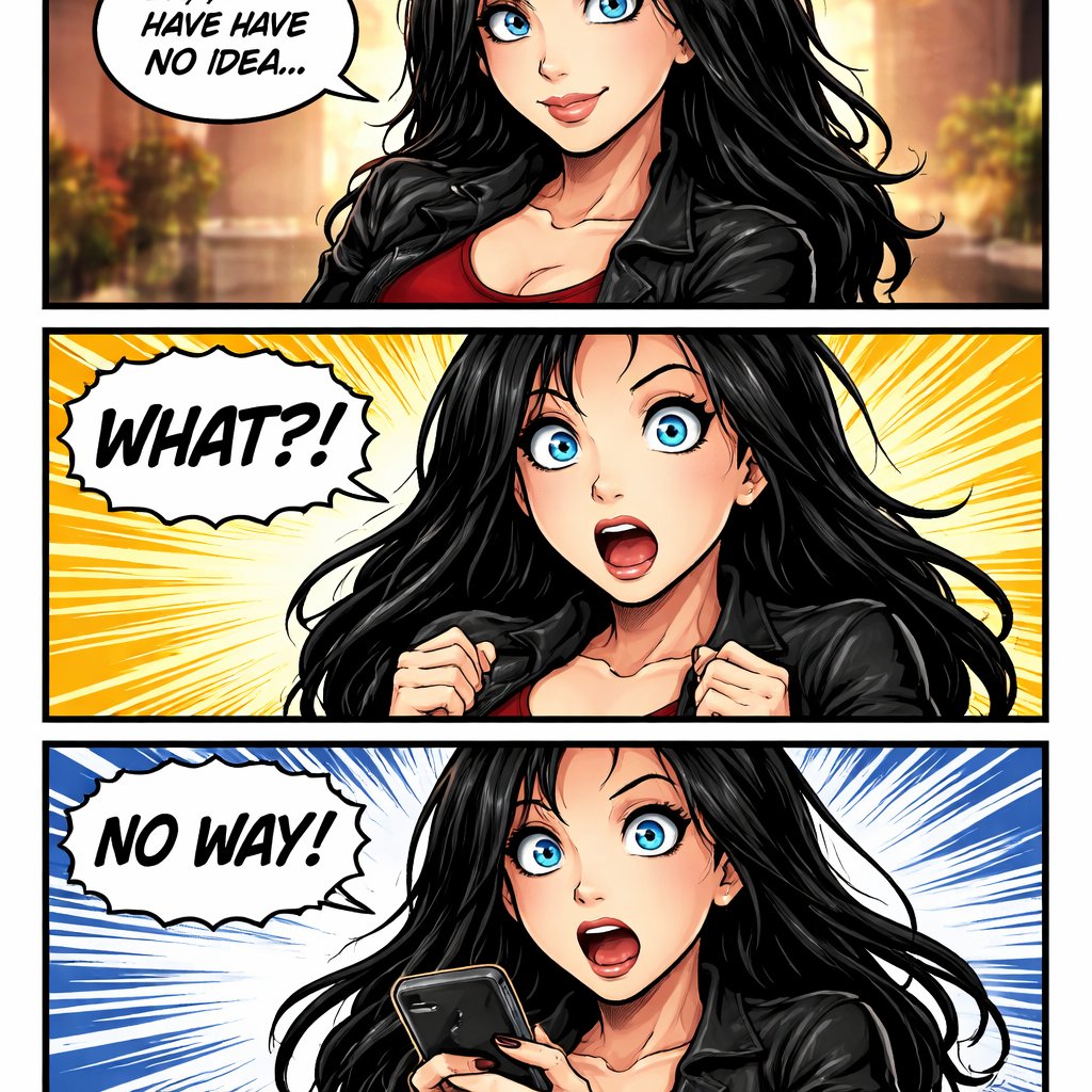 A black haired young woman with blue eyes, three panels in one panel. She has a very sly expression as she speaks in another panel. She shows utter shock in another panel. She also shows shock.