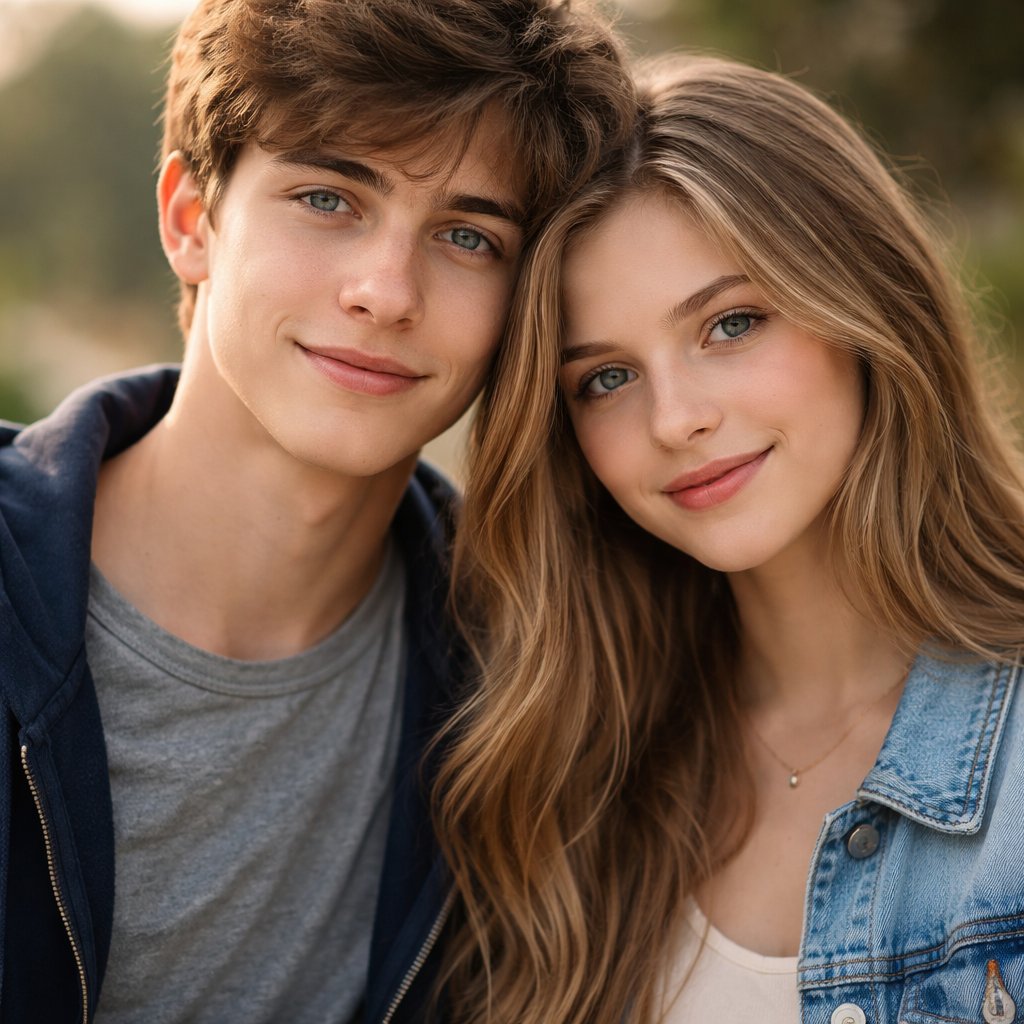 A 17 year old boy who has brown hair and blue eyes. He has a small smile on his face. Next to him is a 17 year old girl who has dirty blonde hair and blue eyes. She has a warm smile.
