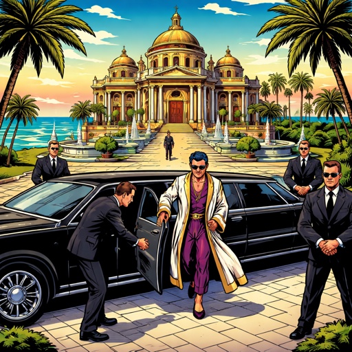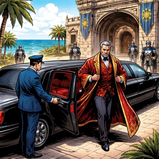 A limousine is stopped in front of a palace. An escort opens the door to the limousine, and a fellow is getting out, dre...