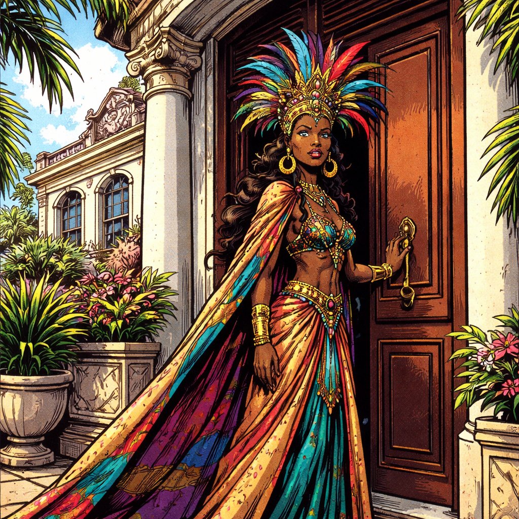 Left side of image- A person in strange colourful costume stands at the door of an expensive villa. Bright day. The door...