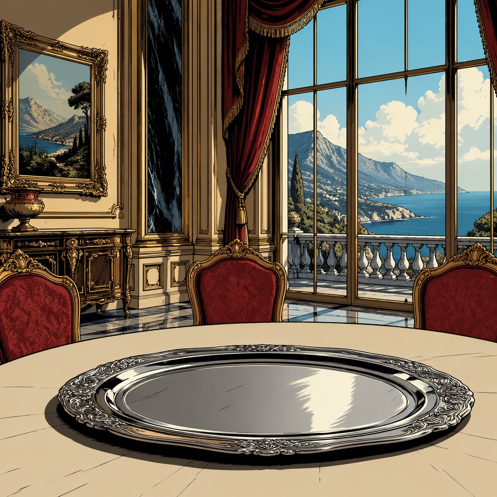 An elegant table with a huge silver platter in the middle, which is empty on either side or candelabra. There are no people in the room is an ultra luxurious old-fashioned dining room with huge windows overlooking the mountains and sea.