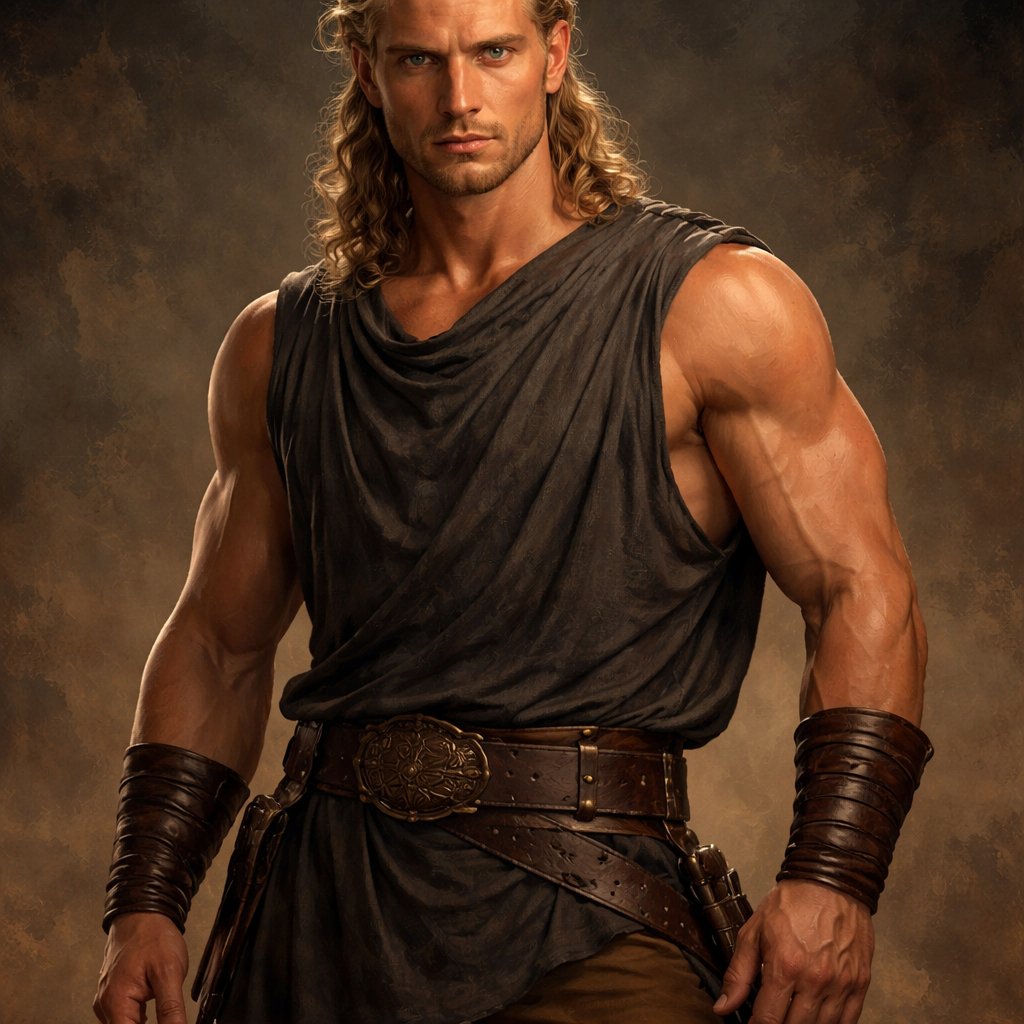 A tall well~proportioned male, so handsome he looks like a Greek god with muscles. With deep-set blue eyes and strong brows, hinting at inner depth“. His hairstyle is a blonde mullet. He works at freak show as a strong man. His outfit consistsed of a Charcoal-toned sleeveless Greek tunic, thick leather belt, leather wristbands/cuffs, brown pants.