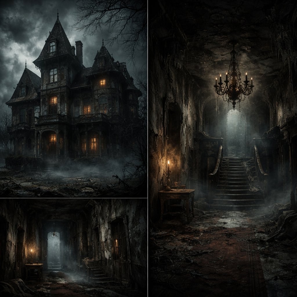 Abandoned decaying haunted mansion with cold spots , whispers and sudden cold spots that invoke intense fear With peeling wallpaper ,