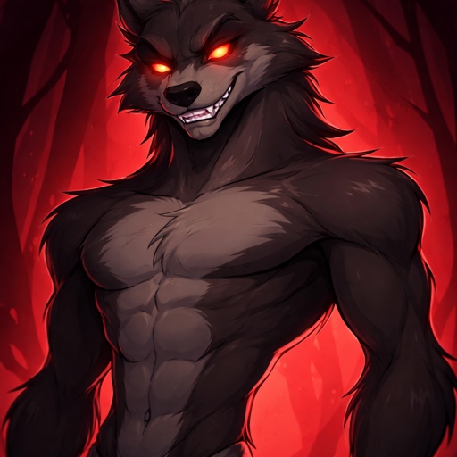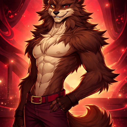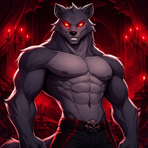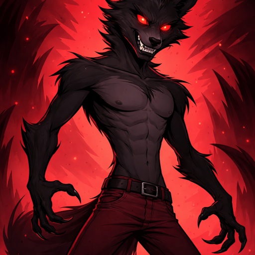 Hazbin hotel styled art : a bear wolf that is shirtless and has alastors body build and isn’t very furry
