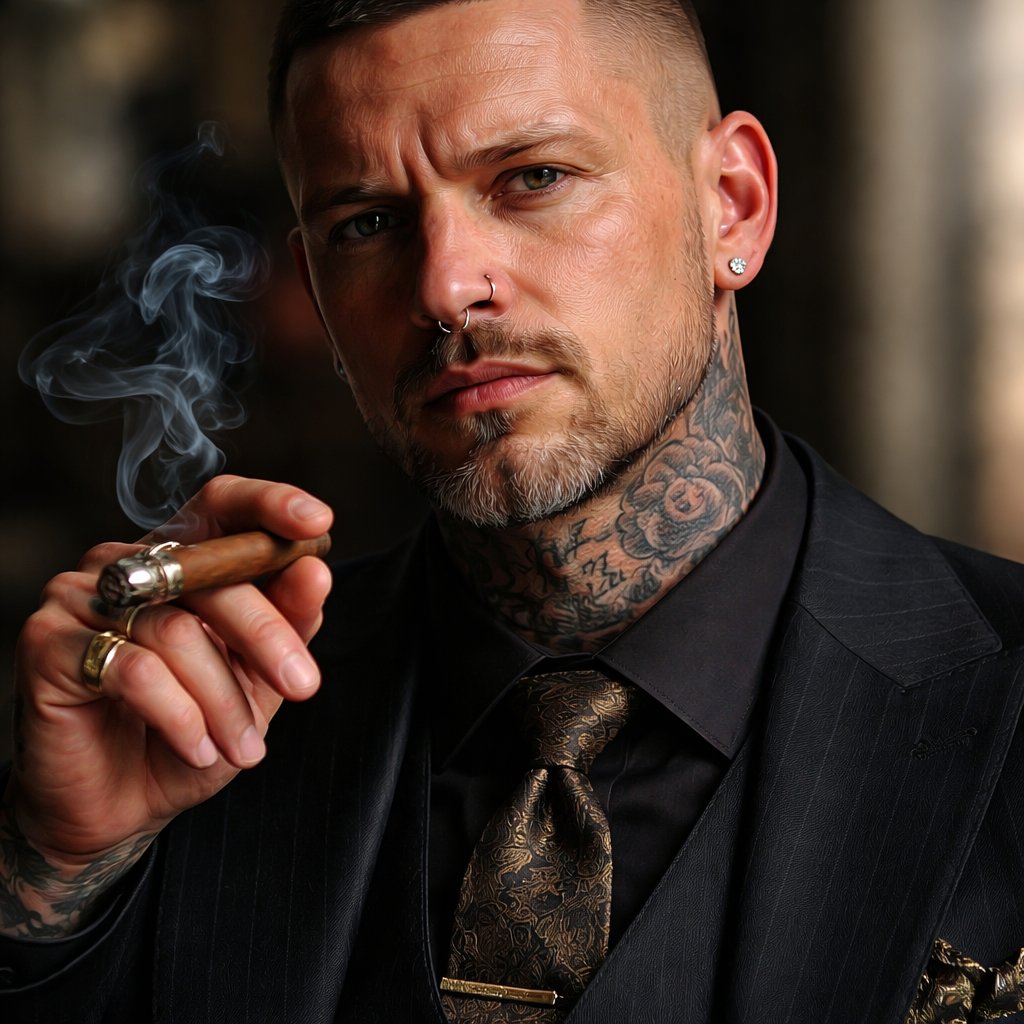 Me as a mafia boss with neck tattoos and with a buzz cut and goatee and nose ring and ear piecing