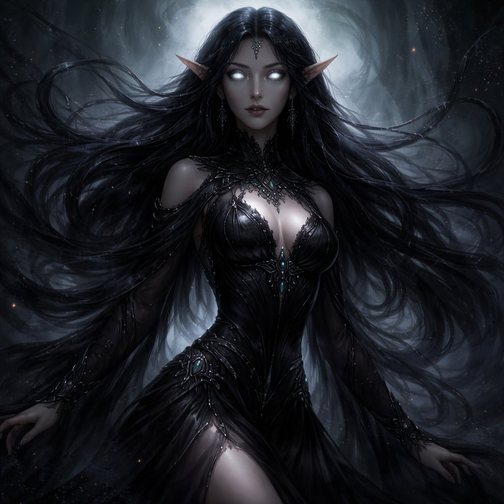 Black cloth, Long black hair, elf ears, empty eyes, Male