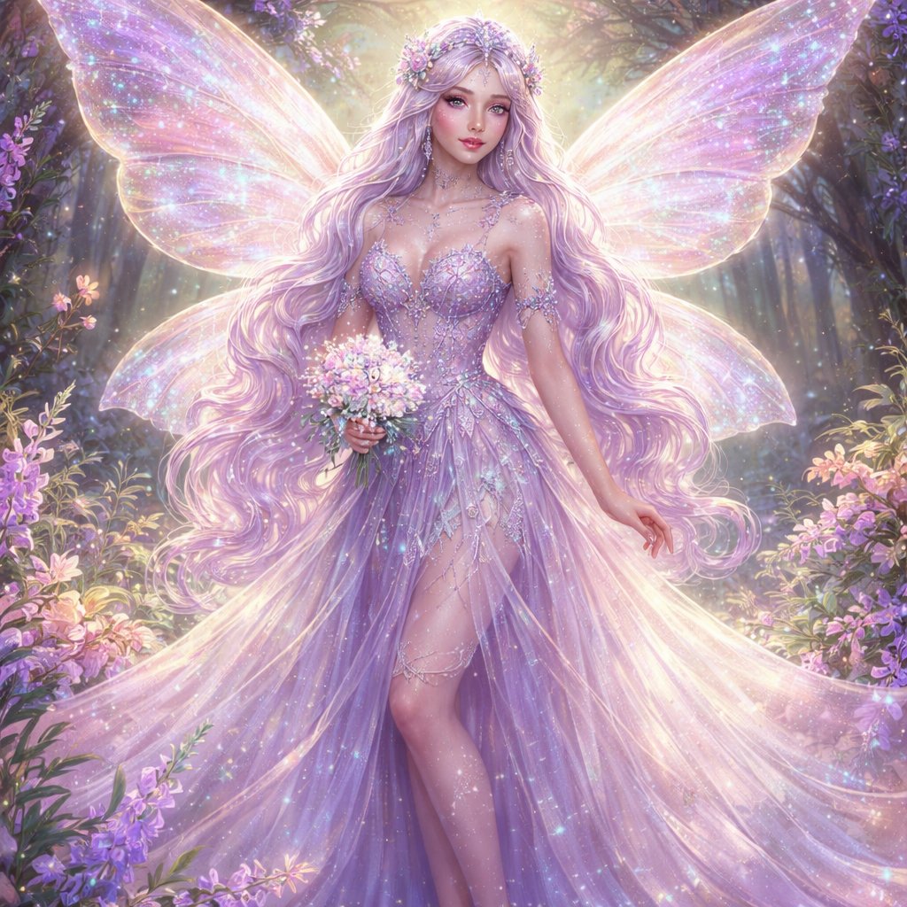 Lavender fairy born in the summer court with long flowing opalescent hair and shimmering opalescent butterfly wings