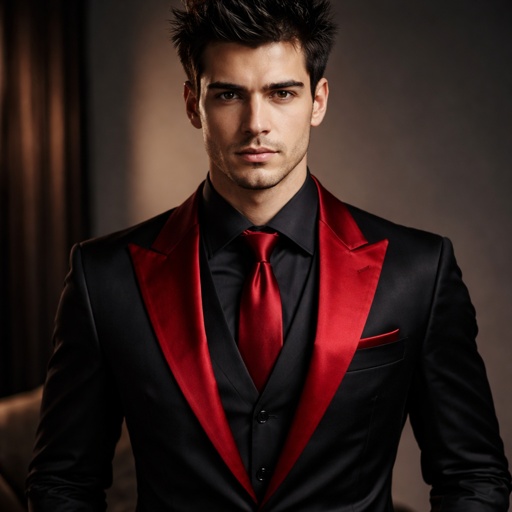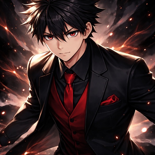 Please create a man, crimson red piercing eyes, sharp smirk, black hair in a mullet like hair style. Strong cheekbones b...