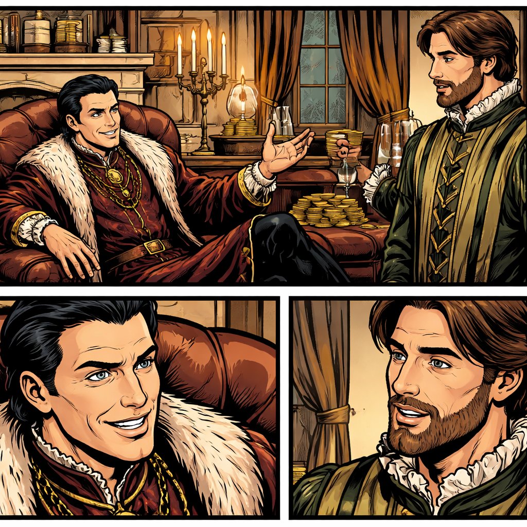 No caricature no speech bubbles very rich sly faced man wearing a Renaissance robe is sitting in an easy chair. A servant stands beside him, also in Renaissance robe and they are having a discussion panel one next panel close-up of the head of one and close-up of the head of the other talking to each other