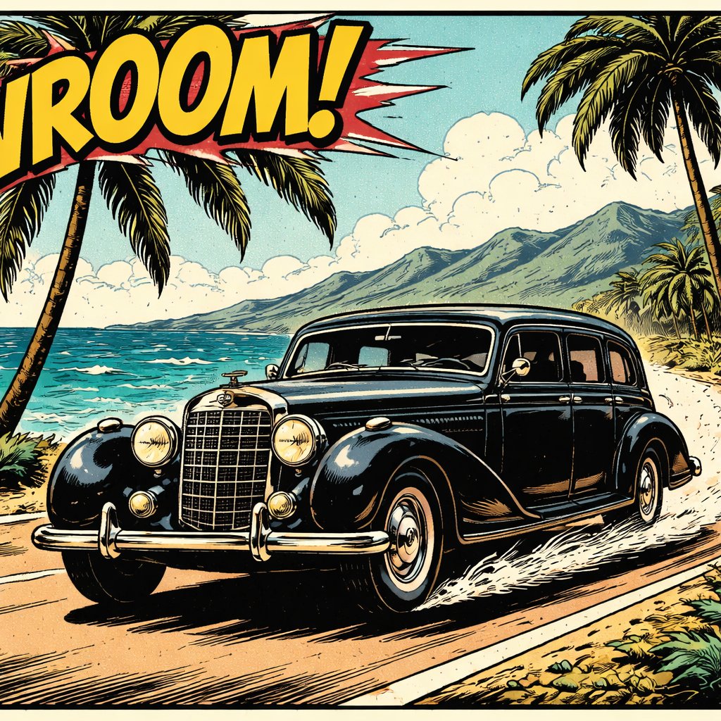 No speech bubbles, an elegant old-fashioned limousine the scene speeding off into the distance on a road lined with palm...