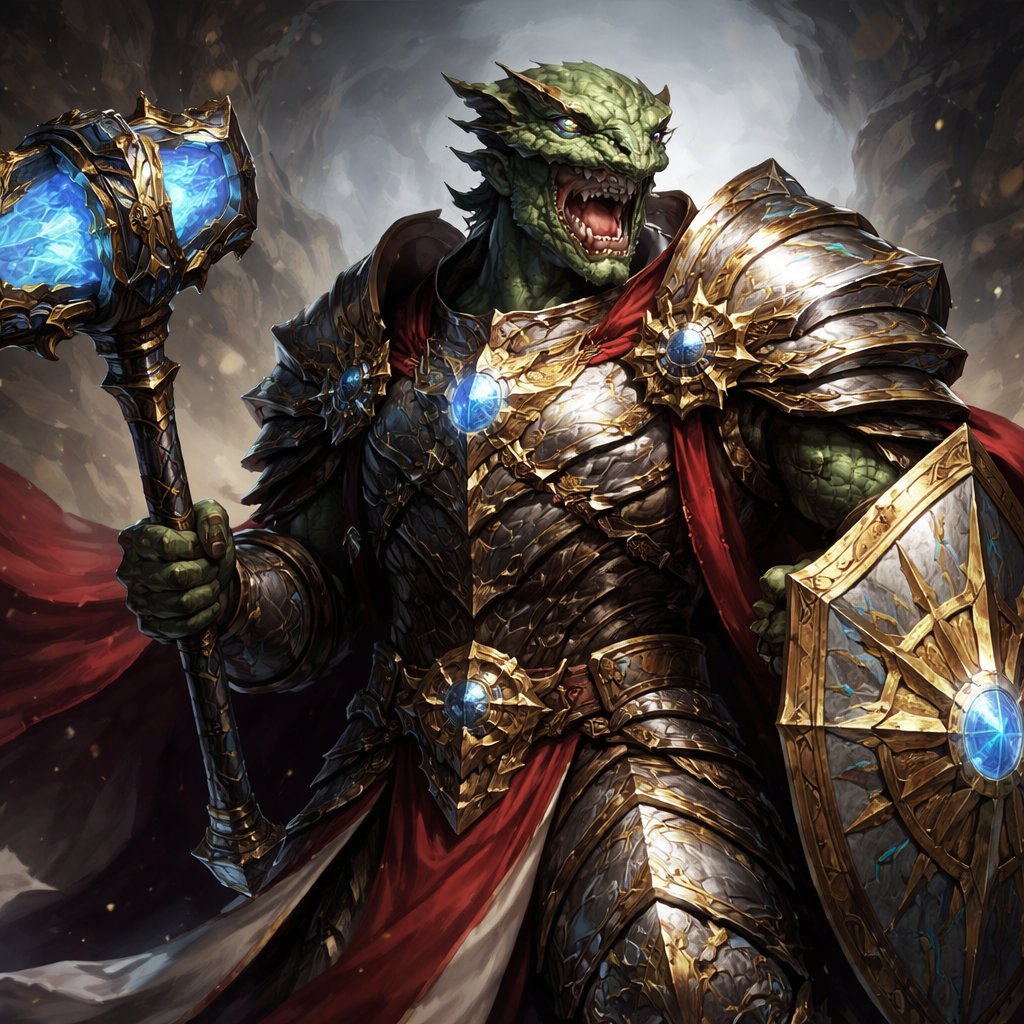 Green Dragonborn dorsal sail, bald, blue eyed, Cleric, fanged maw, Warpreist