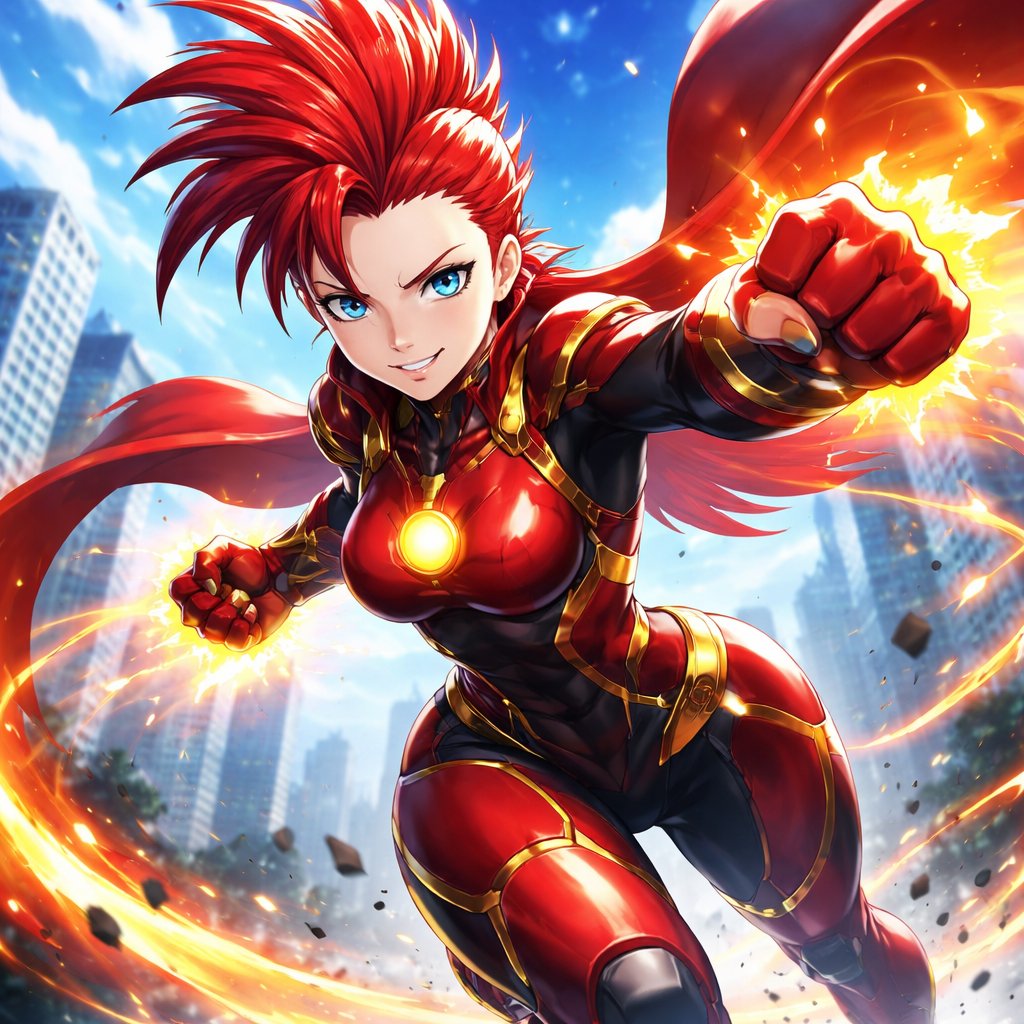 An ex mma fighter in a red and black super suit who has super speed and a technological vest