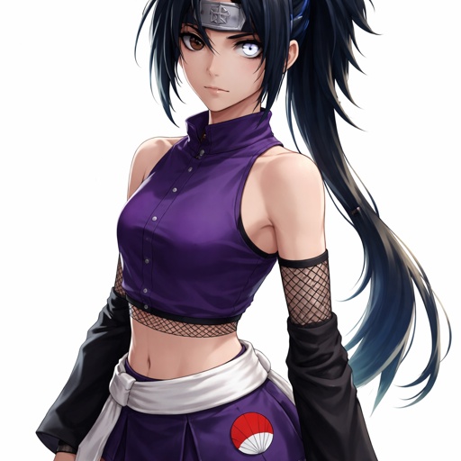 A teenage GIRL that looks like itachi uchiha, has the konoha headband as ONE hair tie with semi long hair, has part blue and part black hair, one eye black and the other white, and uses Sarada uchiha clothes style AND THE UCHIHA AND HOSHIGAKI CLAN logo