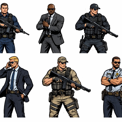 Full and three-quarter view of six armed guards or neatly dressed, they do not stand together. The background is white. ...
