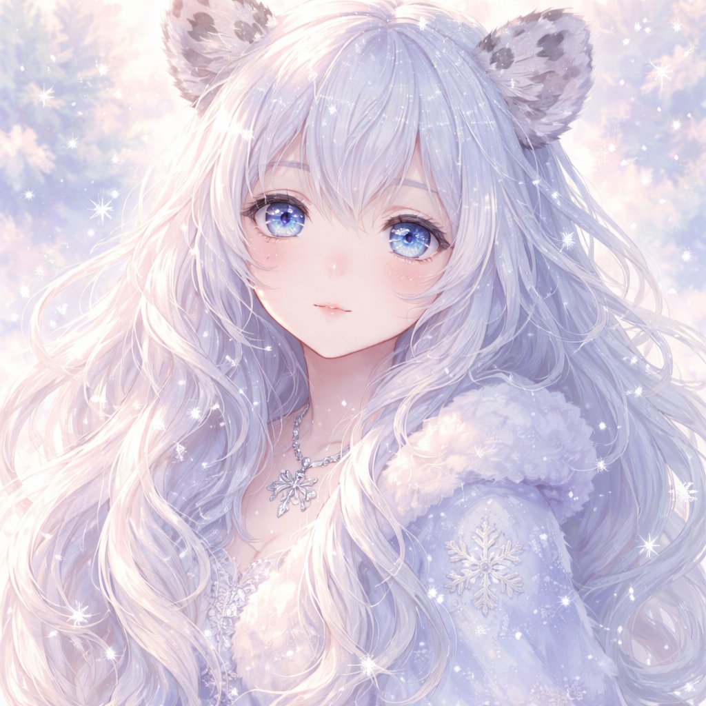 Young girl with white hair being long at the bottom and shortish at the top and blue eyes, her features being like a snow leopard and the personification of snow