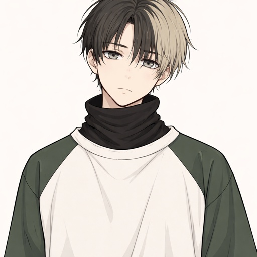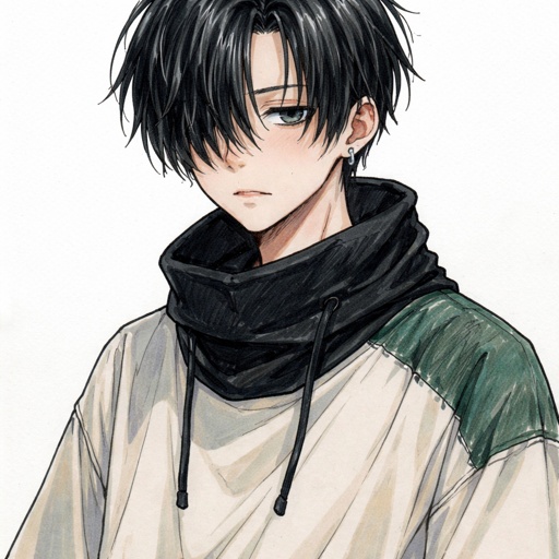 An 18-year-old boy with short hair, longer bangs on the right side falling over his right eye, a loose middle part, and ...