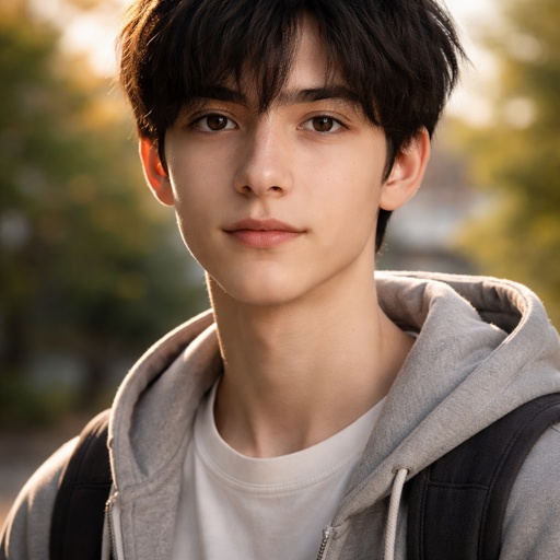 A 19 year old boy who has black hair and brown eyes. He looks strong and determined.