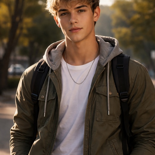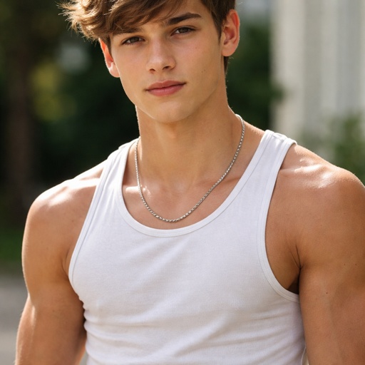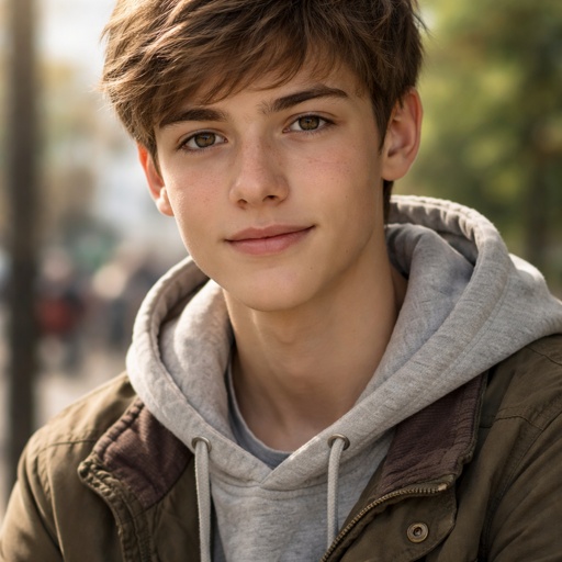 A 17 year old boy who has light brown hair and brown eyes. He looks strong.