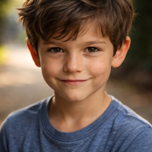 An 8 year old boy who has brown hair and brown eyes. He has a mischievous smirk.