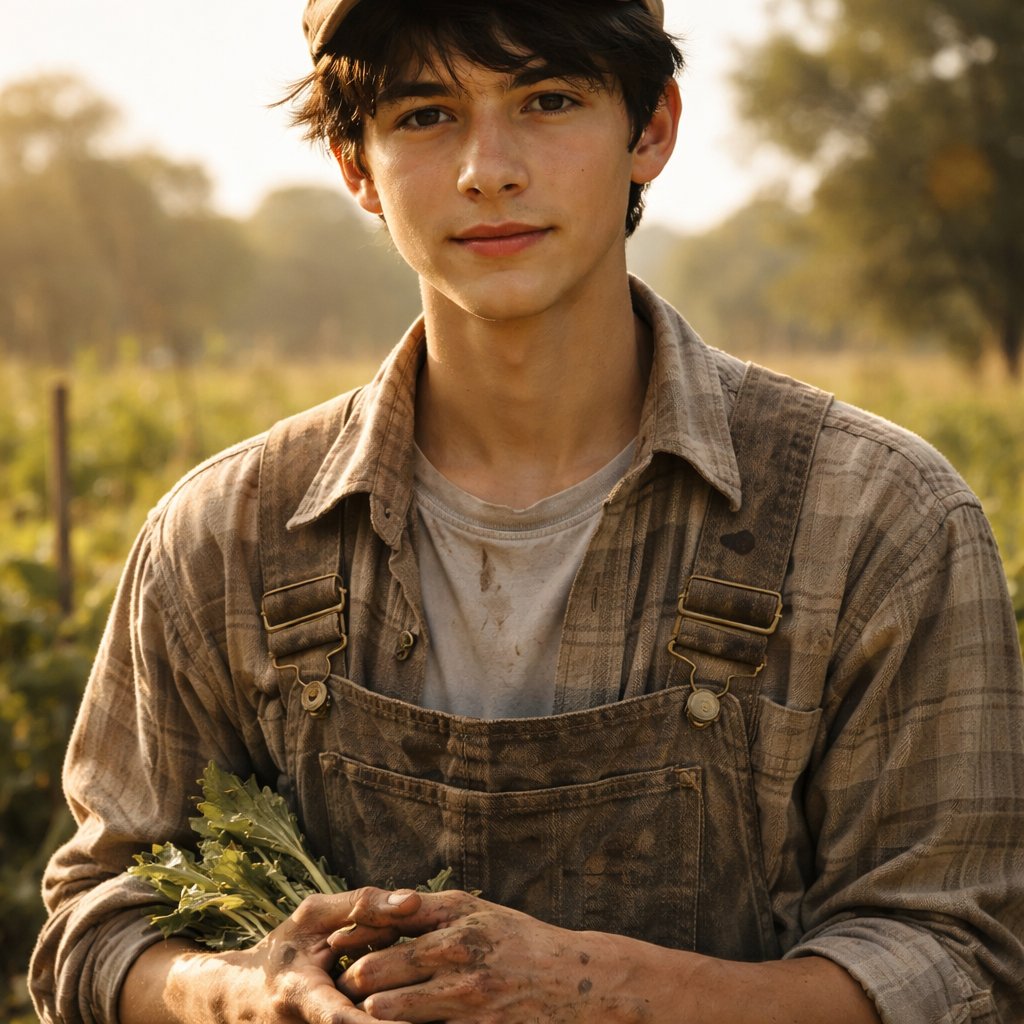 An 18 year old boy who has black hair and brown eyes. He is a farmer.