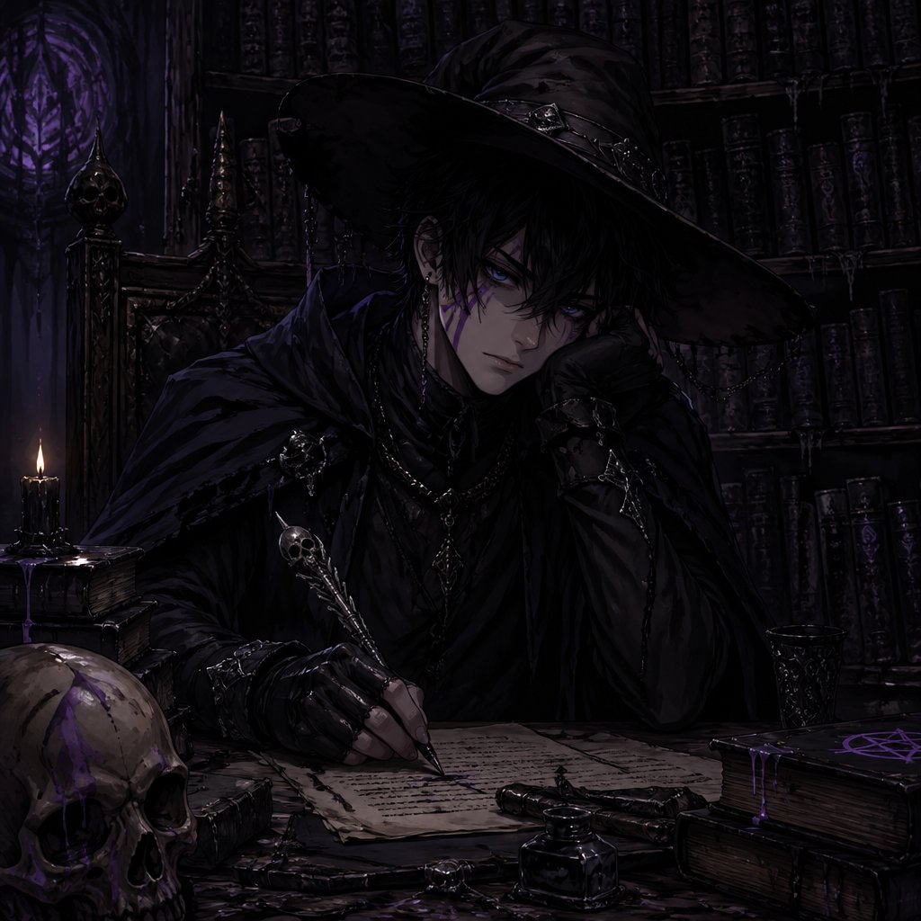 An 18 year old boy who has black hair with purple stripes and blue eyes. He is wearing all black and a black cape. He is wearing a big brown on his head. He is sitting at a desk. Behind him is a big shelf of books of all different sizes. There are blank sheets of paper that cover his desk. He is holding an ink pen in his left hand. He looks bored and tried. The room is dark and has little light.
