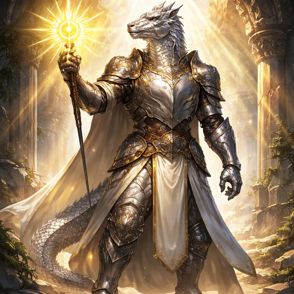 Make golden Dragonborn. Scrawny build. Wields a blue and gold short sword. He is missing three fingers and 70% of his ta...