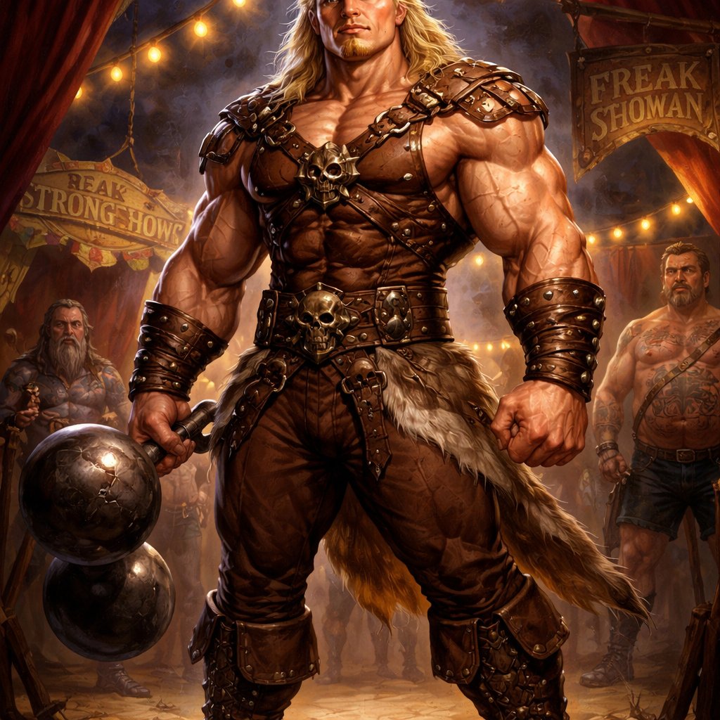 A tall muscular well~proportioned figure ”broad-shoulders, thick neck, giving an impression of sheer power“. His ”expression is often serene or determined, with deep-set blue eyes and strong brows, hinting at inner depth“. His haircut is a blonde mullet. He works at freak show as a strong man. His outfit consistsed of a gladiator like outfit but with brown pants.