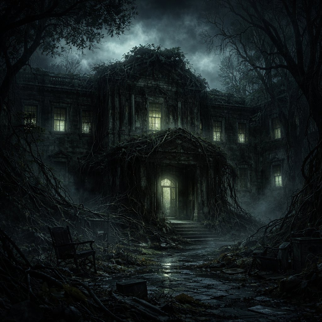 Overgrown ruins , abandoned asylum