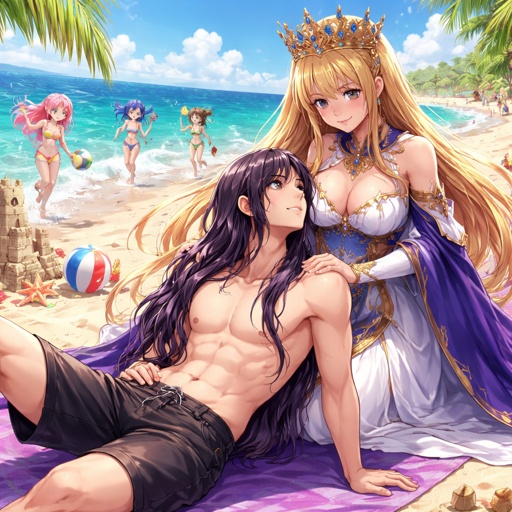 Anime Girls in the beach, Queen him, her boyfriend