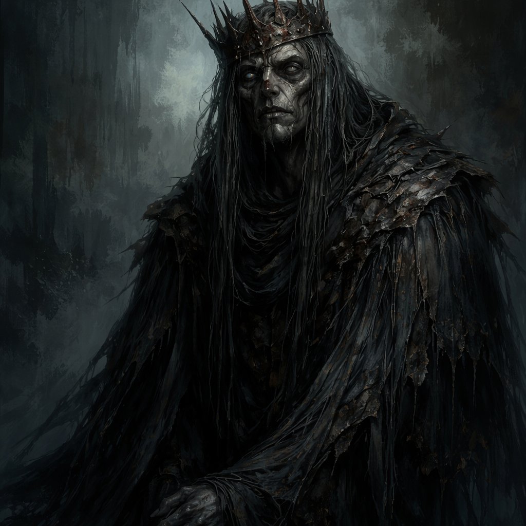 a man who looks as though he should have died years ago—but something refuses to let him go. He is tall but hunched with age, his body thin and almost skeletal beneath layers of black, water-stained robes. His skin is pale with a grayish tint, stretched tight across sharp cheekbones. His eyes… are the most unsettling part—clouded, yet somehow still watching, as if something deeper peers through them. A fractured iron crown rests crooked on his head, its points bent and jagged. Rust stains run down his temples like dried blood. • His voice is low and hollow, like it echoes from underwater • His hands tremble constantly, yet never when holding power or passing judgment • He smells faintly of damp earth and old stone Rumor: Some say Malrec drowned long ago in the mire… and what sits on the throne is something that climbed back out.