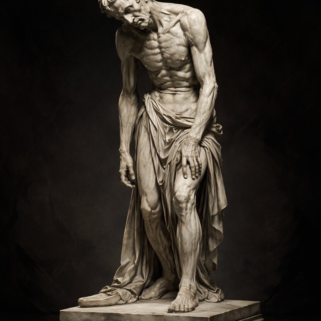 Refined realistic, no speech bubbles, no caricature a sculpture of a very tired, weak old man. His face is in pain. Full...