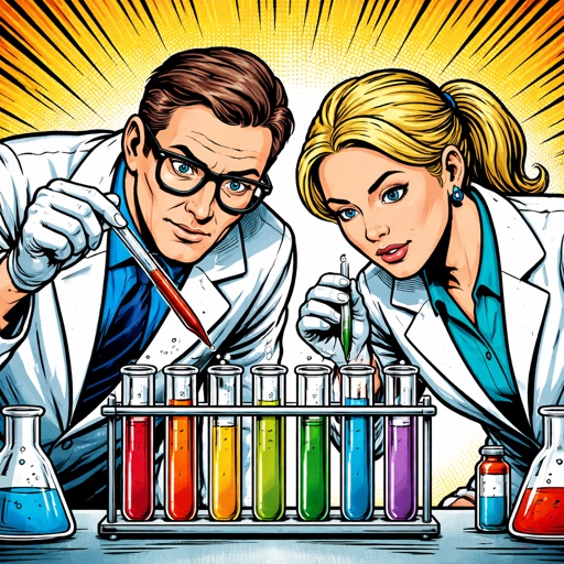 Two scientists are bending over test tubes with coloured fluids. One wears thick glasses. Refined. Relaistic