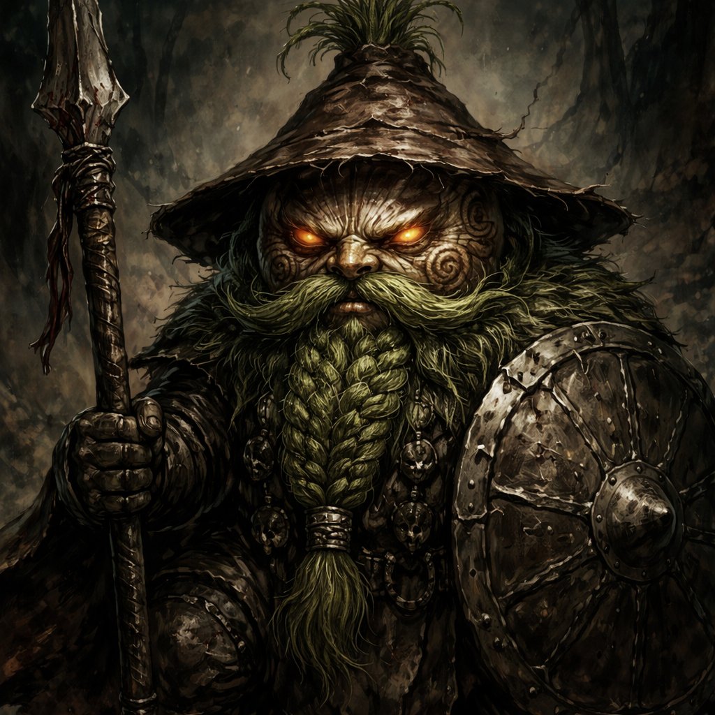 A dwarf onion head with a hat on his head green hair curly mustache braided thick beard has a tatto of a spiral on his face he has a shield and spear at the ready