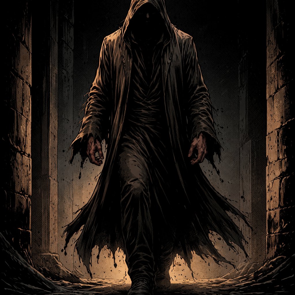 Realistic, refined. Very dark scene, a tall man in a tattered robe walks toward us.Full body shot. He is normal proportions. We can’t see his face.