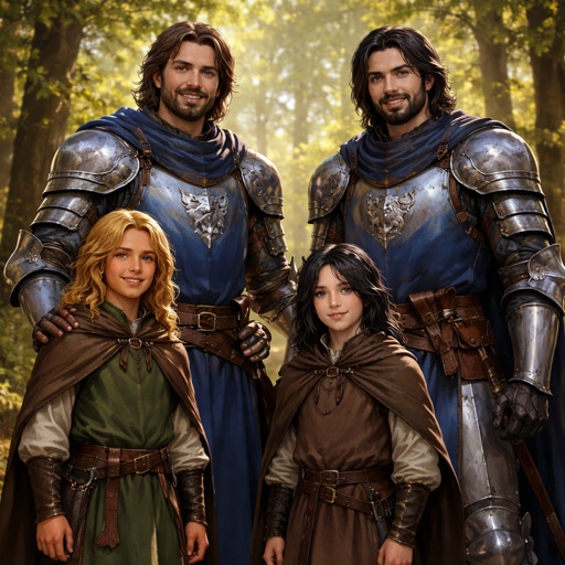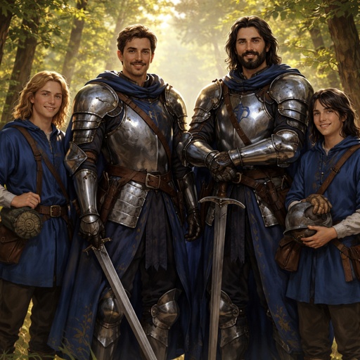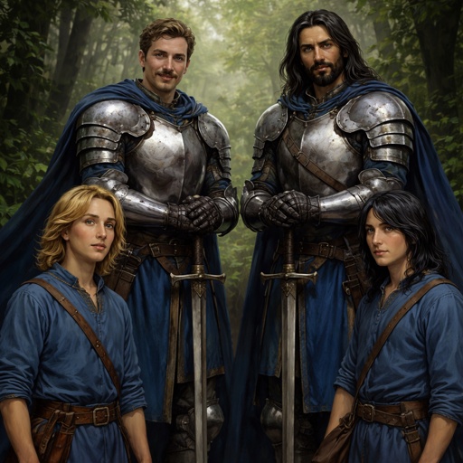 Two adult make knights, both in silver and blue armor. One knight has brown hair and a beard, the other has black hair a...