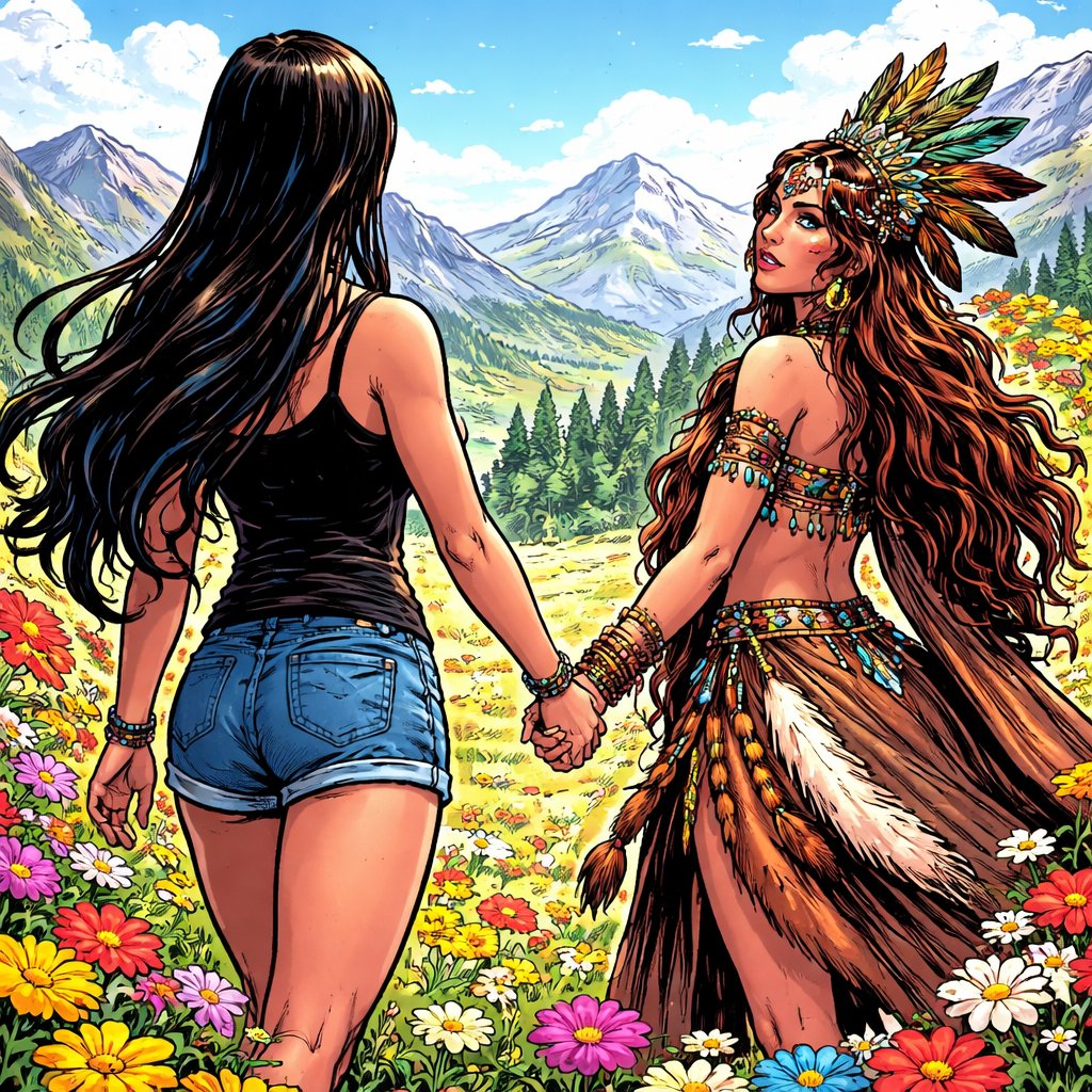 A tall young woman with long black hair rear view is holding the hand of a beautiful female shaman. They are surrounded by colourful flowers and lovely mountains in the distance. bright day